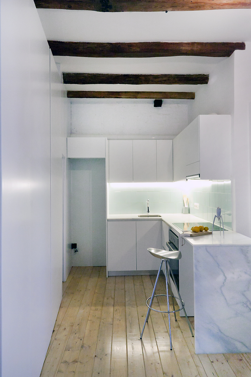 [esp] Se trata de una vivienda situada en el último piso de un edificio plurifamiliar ubicado en la calle Roger de Flor, de Barcelona. La geometría de la planta es absolutamente triangular, y de superfície útil 35m2. La distribución consiste en una sala-comedor-cocina, un baño completo y una habitación con vestidor. El suelo es de madera de pino de flandes, se destaparon las vigas, se aisló térmicamente el techo y se conservaron testigos de las pinturas originales. La iluminación es principalmente a base de leds y de bajo consumo.